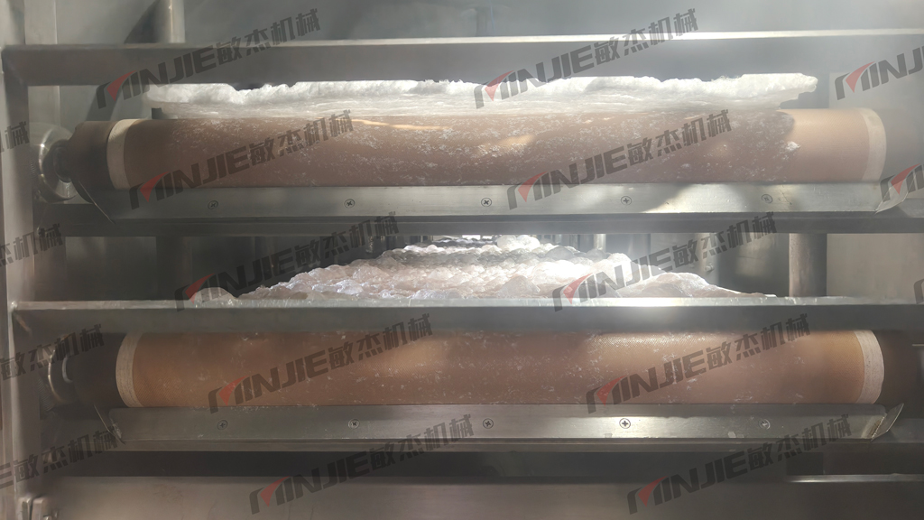 在上海敏杰的試驗(yàn)室內(nèi),山東公司的代表全程觀摩了試驗(yàn)過程。從高粘度的麥脂糖漿被均勻地涂布在鋼帶上,進(jìn)入真空干燥腔,到最終產(chǎn)出蓬松、干爽的固體泡沫帶,整個流程順暢、穩(wěn)定。