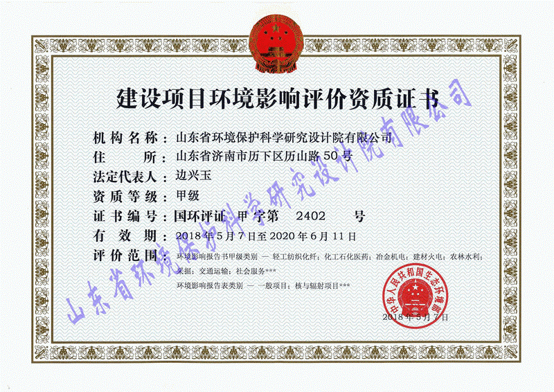 環(huán)境保護部頒發(fā),證書編號:甲字第2402號
