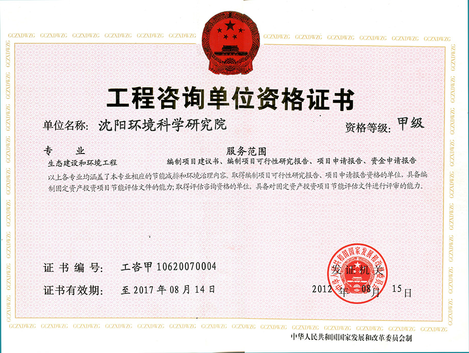 沈陽(yáng)環(huán)境科學(xué)研究院成立于1963年,是國(guó)內(nèi)最早從事環(huán)境科研的單位之一,具有國(guó)家頒發(fā)的建設(shè)項(xiàng)目環(huán)境影響評(píng)價(jià)(脫鉤改制后剝離)、環(huán)境工程咨詢、環(huán)境工程設(shè)計(jì)等3個(gè)甲級(jí)資格證書(shū)。