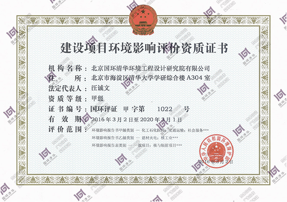 環(huán)境保護(hù)部頒發(fā),證書(shū)編號(hào):國(guó)環(huán)評(píng)證甲字第1022號(hào)
