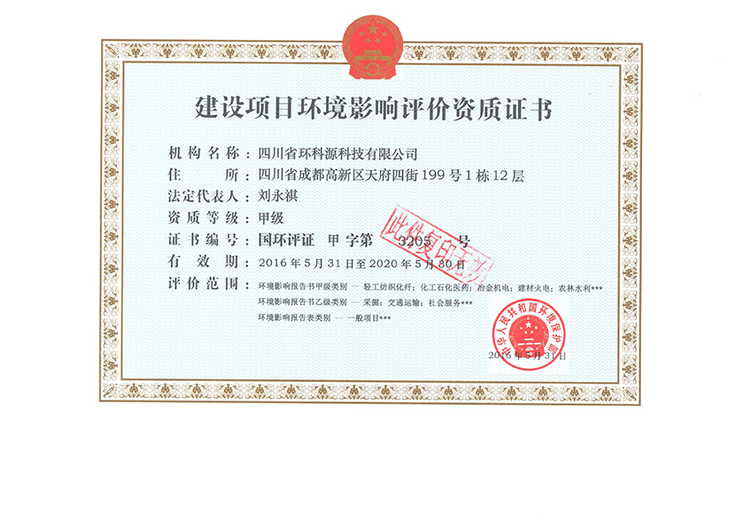 公司持有建設(shè)項(xiàng)目環(huán)境影響評價(jià)甲級資質(zhì)證書,是中國環(huán)保產(chǎn)業(yè)協(xié)會環(huán)境影響評價(jià)行業(yè)分會副主任委員單位、四川省環(huán)保產(chǎn)業(yè)協(xié)會環(huán)評分會會長單位,通過了“ISO三體系認(rèn)證”。被省環(huán)保產(chǎn)業(yè)協(xié)會評選為2016年度“四川省環(huán)保產(chǎn)業(yè)50強(qiáng)”企業(yè)。