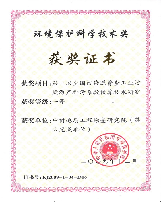 (2)2009年我院參與的第一次全國(guó)污染物普查工業(yè)污染源產(chǎn)排污系數(shù)調(diào)查--《非金屬礦采選業(yè)產(chǎn)排污系數(shù)核算課題》項(xiàng)目獲原環(huán)境保護(hù)部一等獎(jiǎng)。