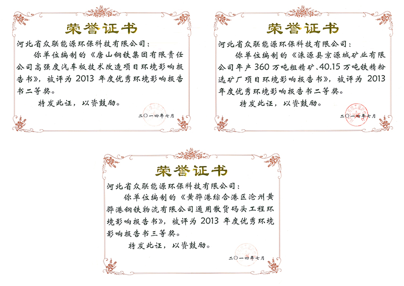 (1)《淶源縣京源城礦業(yè)有限公司年產(chǎn)360萬噸粗精礦、40.15萬噸鐵精粉選礦廠項(xiàng)目環(huán)境影響報(bào)告書》被評(píng)為2013年度優(yōu)秀環(huán)境影響評(píng)價(jià)報(bào)告書二等獎(jiǎng)