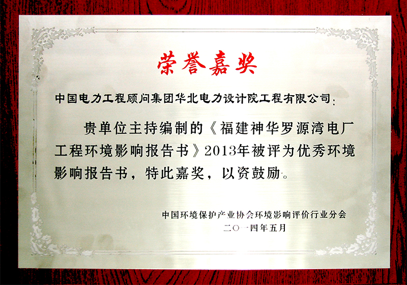 (7)《福建神華羅源灣電廠工程環(huán)境影響報告書》獲中國電力規(guī)劃設(shè)計協(xié)會2014年度電力行業(yè)優(yōu)秀工程咨詢成果一等獎、中國環(huán)境保護(hù)產(chǎn)業(yè)協(xié)會環(huán)評分會2013年優(yōu)秀報告書獎。