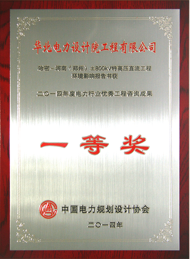 (9)《哈密~河南(鄭州)±800kV特高壓直流工程環(huán)境影響報告書》獲中國電力規(guī)劃設(shè)計協(xié)會2014年度電力行業(yè)優(yōu)秀工程咨詢成果一等獎。