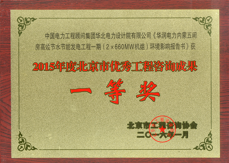 (10)《華潤電力內(nèi)蒙古五間房高效節(jié)水節(jié)能發(fā)電工程一期(2×660MW機(jī)組)環(huán)境影響報告書》獲2015年度北京市優(yōu)秀工程咨詢成果一等獎;