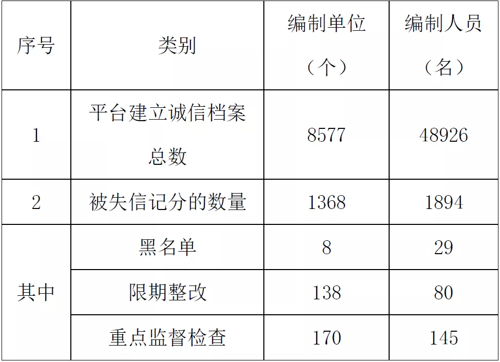 表1 信用平臺建立誠信檔案及失信記分的編制單位及個人數(shù)量表