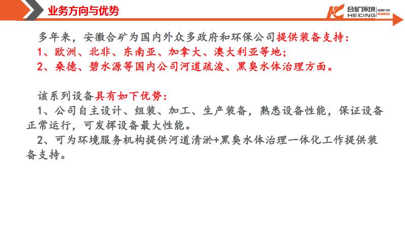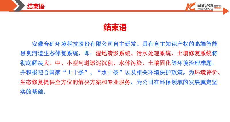 2019年1月10日-11日,環(huán)境評價(jià)行業(yè)發(fā)展大會在杭州召開。安徽合礦環(huán)境科技股份有限公司胡乾桂董事長作了『污水處理和土壤修復(fù)一體化裝備與環(huán)境服務(wù)的結(jié)合』的報(bào)告,詳細(xì)介紹了國內(nèi)河道清淤工程與黑臭水體一體化處理裝備的發(fā)展情況、工程案例,咨詢機(jī)構(gòu)如何與土壤修復(fù)一體化裝備聯(lián)合服務(wù)等內(nèi)容。